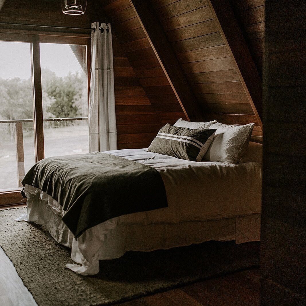 No andar superior, o mezanino abriga o quarto principal, com uma cama confortável posicionada de forma estratégica para apreciar a vista ao acordar. O ambiente transmite uma sensação de refúgio privado, perfeito para descansar depois de um dia explorando a região.