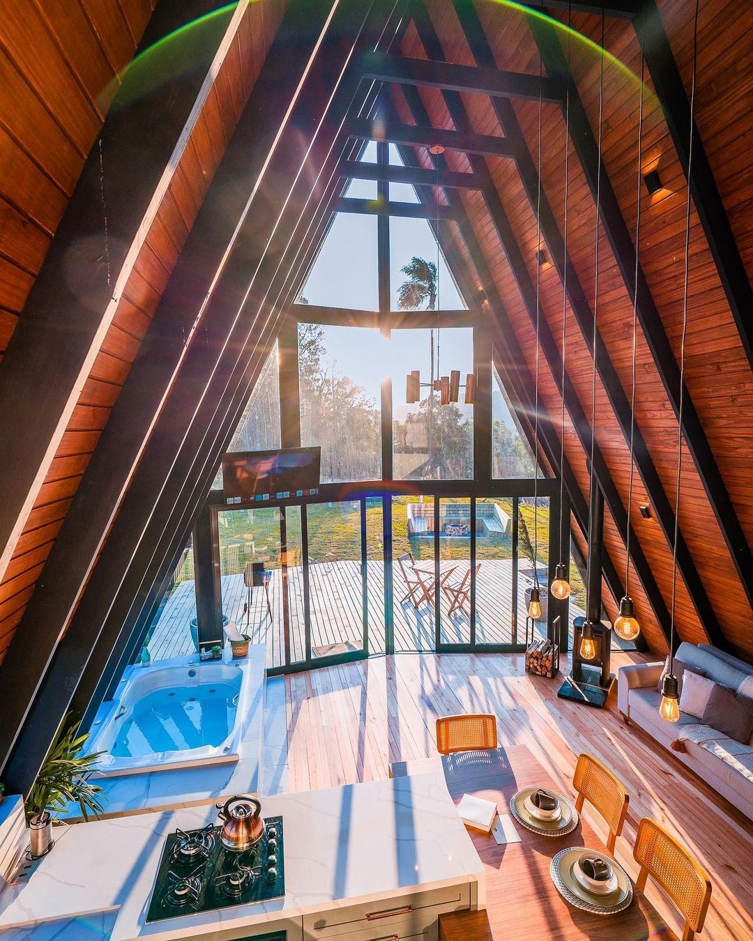A área social integrada favorece momentos a dois, seja para um café da manhã especial ou uma noite relaxante. Em muitas cabanas, o clima romântico é reforçado por elementos que valorizam a experiência, como iluminação suave e ambientes intimistas.