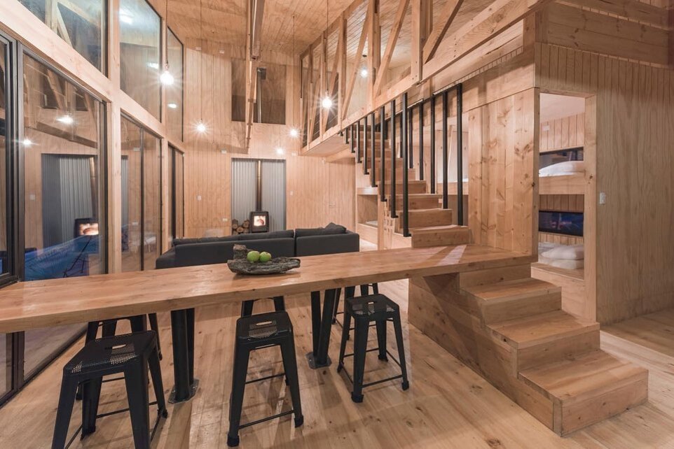 Um dos grandes destaques da Casa La Quimera Patagonia é o cuidado com a arquitetura. O projeto apresenta uma estética contemporânea, mas sem perder o vínculo com a tradição construtiva da região.