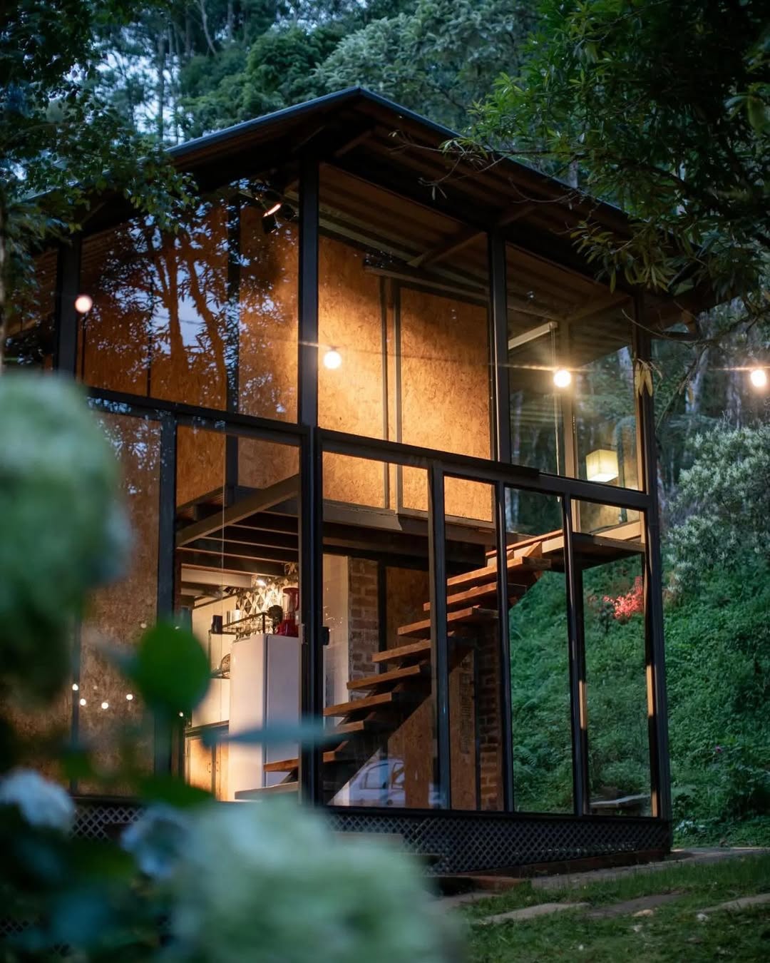 A arquitetura dos chalés é um dos grandes destaques da hospedagem. Cada unidade foi projetada para valorizar a vista, a iluminação natural e a sensação de refúgio.