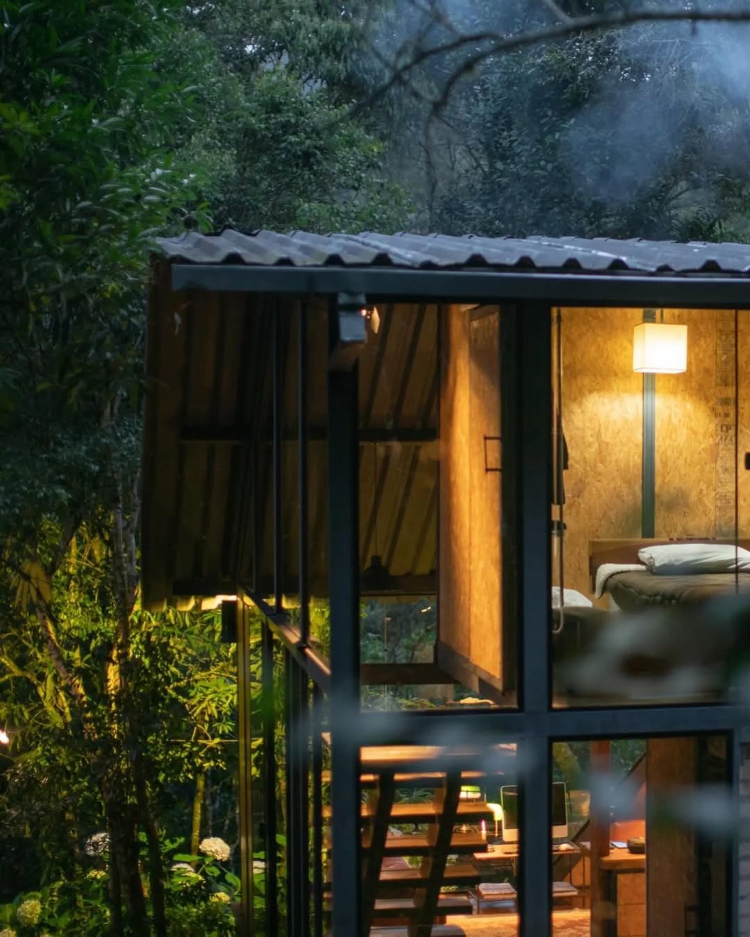 O Chalé de Vidro, por exemplo, traz um conceito moderno e imersivo, permitindo que a paisagem externa faça parte do interior da acomodação. Já o Chalé Triangular apresenta estética marcante e integração com o terreno natural, oferecendo varanda com vista privilegiada para o rio e para as montanhas.