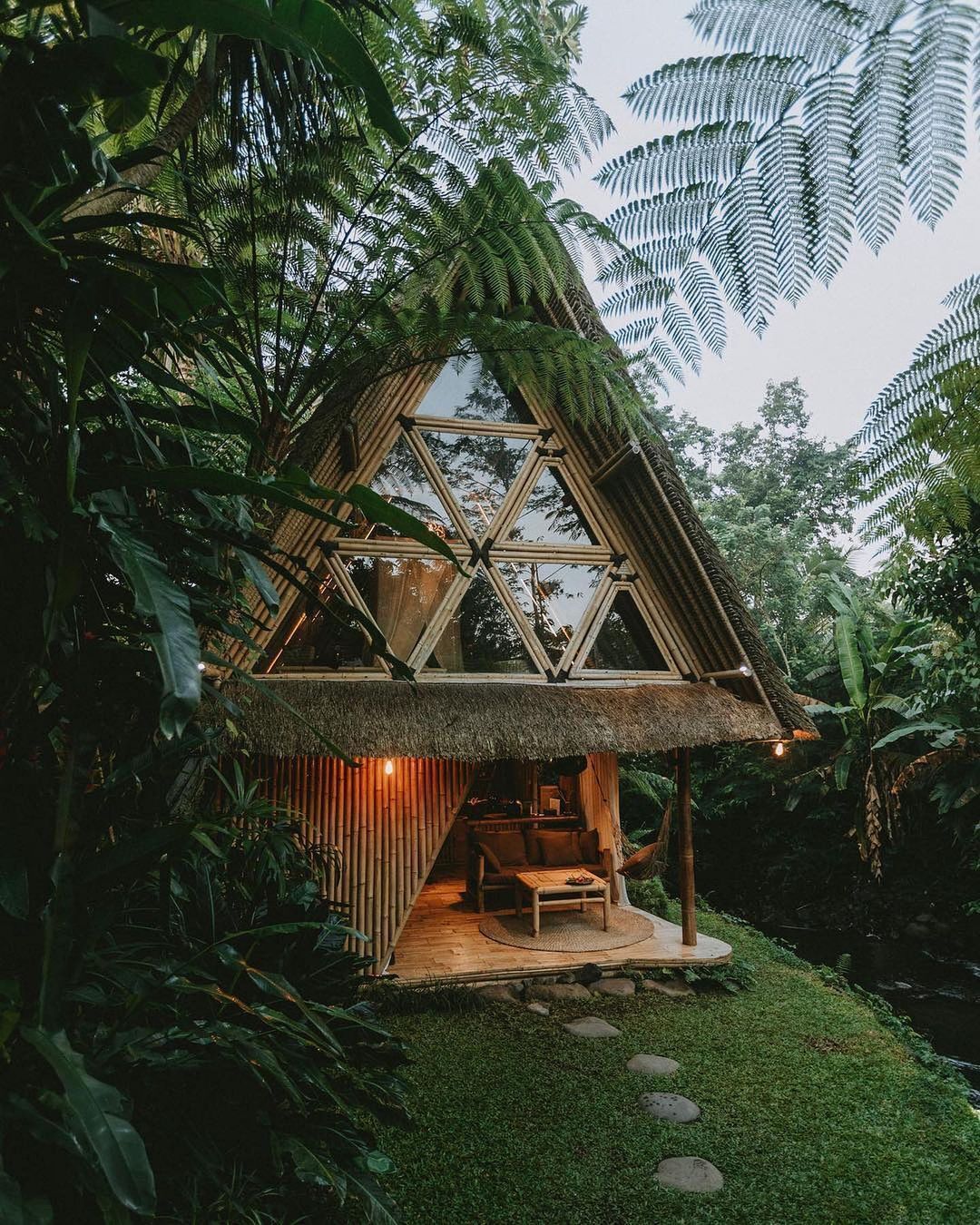 O som do rio correndo ao lado da propriedade, a vegetação tropical ao redor e a arquitetura orgânica criam uma atmosfera quase mágica.