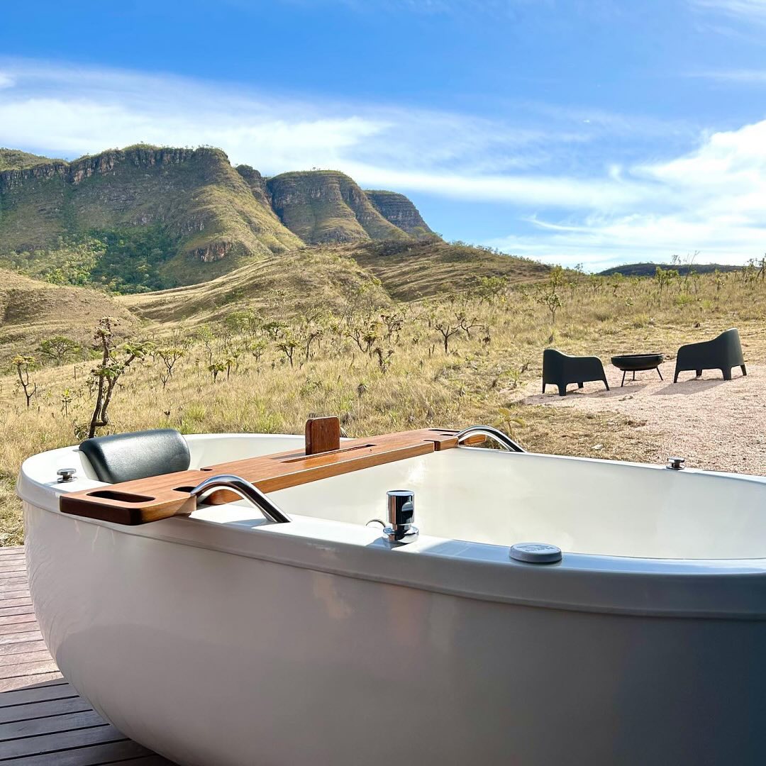 A proposta do Mirante Átria valoriza experiências simples e profundas: observar o céu estrelado, relaxar na banheira externa e aproveitar o silêncio natural da Chapada são atividades marcantes da estadia.