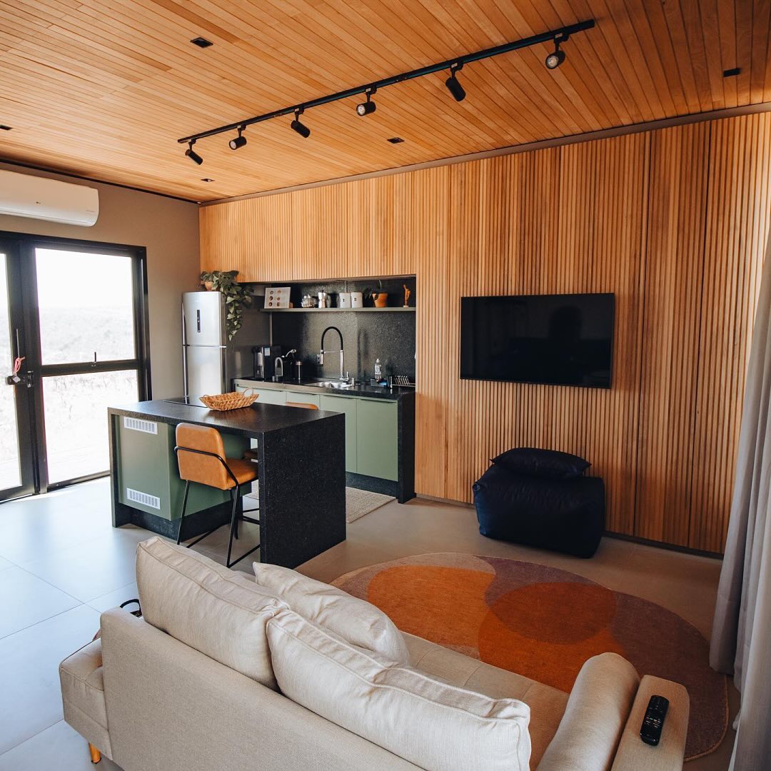 O projeto das cabanas foi pensado para oferecer conforto elevado com estética minimalista e aconchegante. O uso de madeira, vidro e elementos naturais cria um ambiente acolhedor e elegante, mantendo a proposta de imersão na paisagem do cerrado.