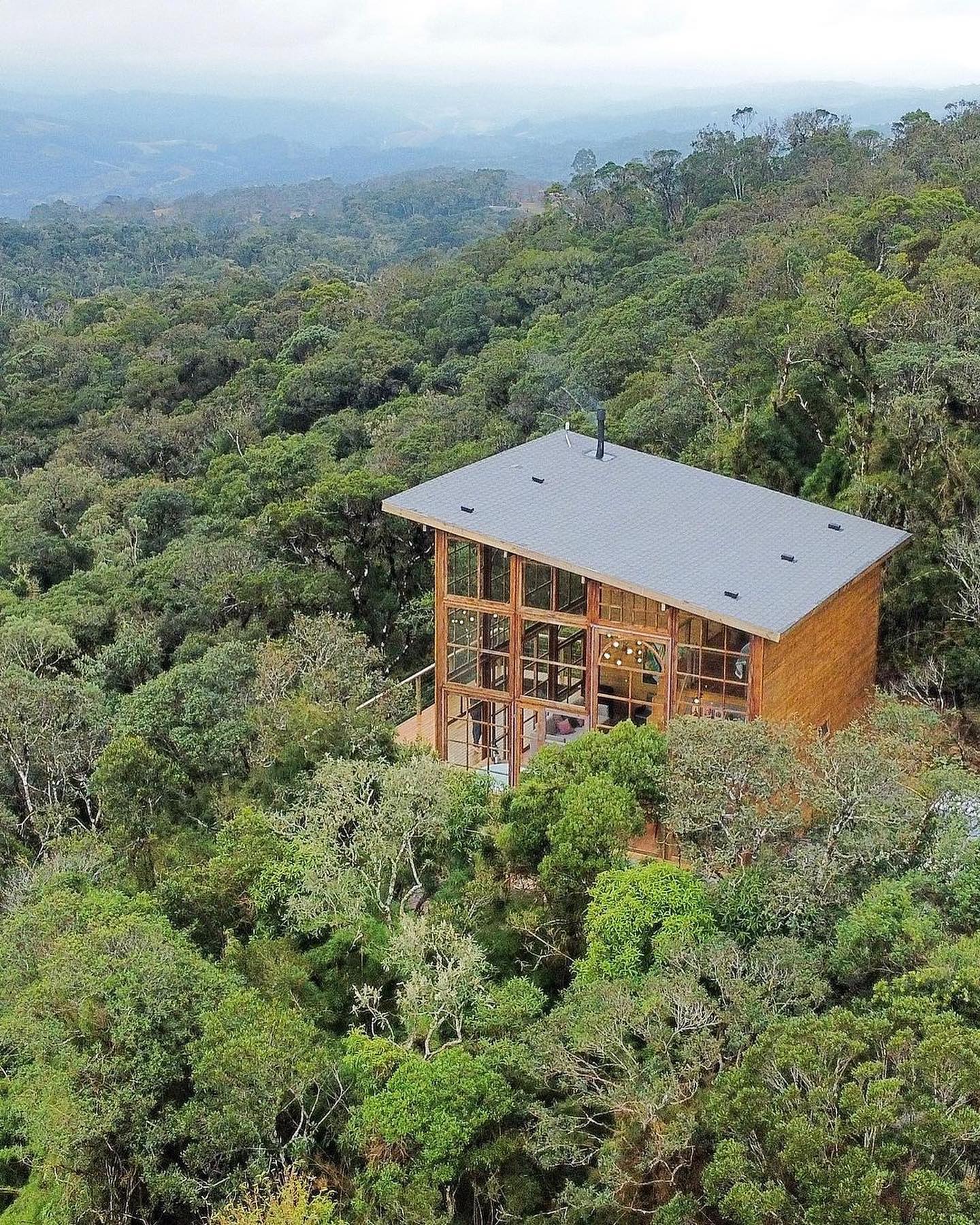 Grandes janelas e decks panorâmicos permitem que os hóspedes contemplem o nascer e o pôr do sol da serra. Essa conexão visual com o entorno faz parte da experiência de hospedagem, transformando cada momento em algo especial.