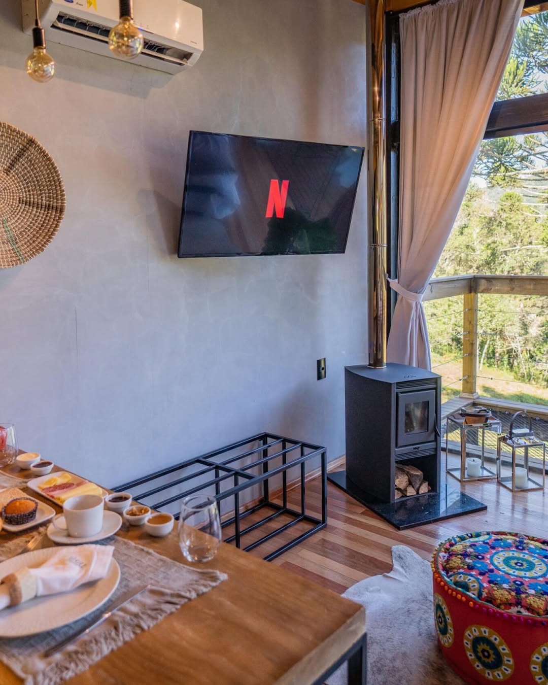 A cabana oferece estrutura completa para estadias confortáveis, mantendo o conceito de refúgio natural. Entre os principais destaques estão: