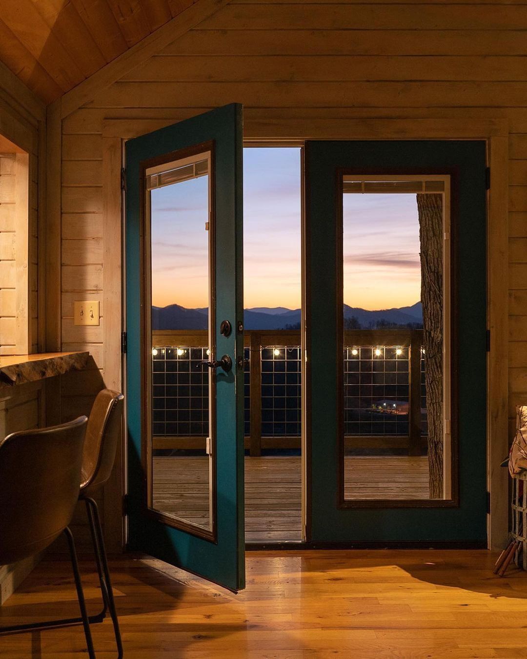O interior costuma trazer decoração elegante e minimalista, com madeira aparente, iluminação suave e grandes aberturas voltadas para a floresta.