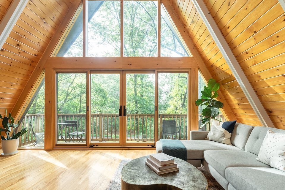 Na Upstate A-Frame, o projeto valoriza elementos clássicos desse estilo arquitetônico, como: