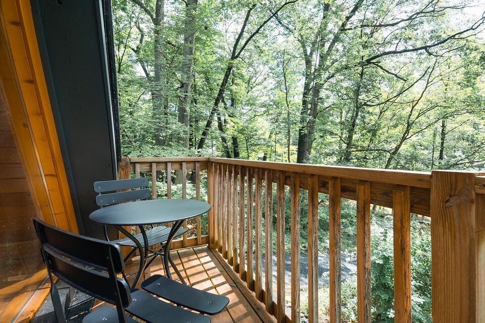 Grande parte da experiência na Upstate A-Frame acontece dentro da própria propriedade. O ambiente natural ao redor cria o cenário ideal para relaxar e aproveitar momentos tranquilos.